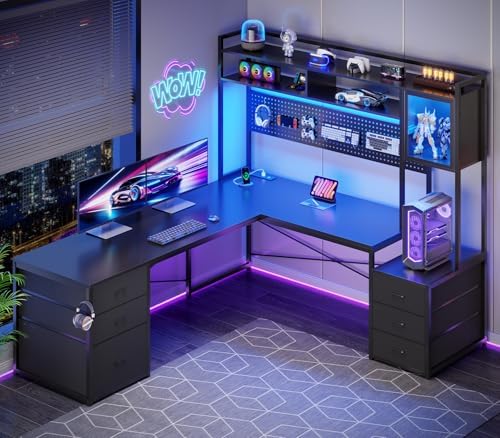 SEDETA L Shaped Gaming Desk with Drawers, Reversible Computer Corner Desk with File Drawer, Hutch, Storage Shelves for Home Office, Gaming Two Person Desk with Led Lights, Power Outlet, Black